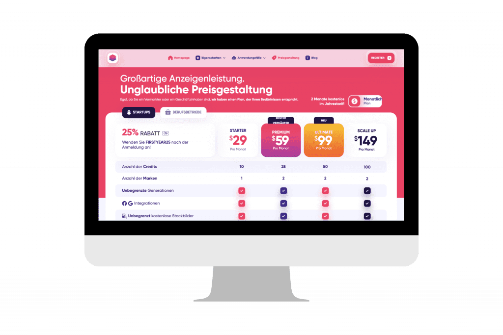 AdCreative.ai bietet verschiedene Preispläne an, je nach Anforderungen und Nutzungsumfang. Es gibt eine kostenlose Testversion sowie verschiedene Abonnement-Optionen, die monatlich oder jährlich abgerechnet werden können. Die Preise beginnen bei 29 US-Dollar pro Monat für das Starterpaket und können je nach Funktionsumfang und Nutzung variieren.